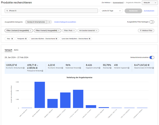 Achte bei der Auswertung der Ergebnisse darauf, nur Daten identischer oder ähnlicher Artikel zu betrachten und verlasse dich nicht ungesehen auf den angezeigten durchschnittlichen Verkaufspreis. Dieser unterscheidet beispielsweise nicht zwischen Produkten und Ersatzteilen. Suchst du nach dem optimalen Verkaufspreis für das Spiel "Monopoly" werden sowohl Ergebnisse für das Spiel "Monopoly", als auch für Ersatzteile für Monopoly eingeschlossen. Das drückt vermeintlich den durchschnittlichen Verkaufspreis.